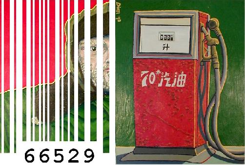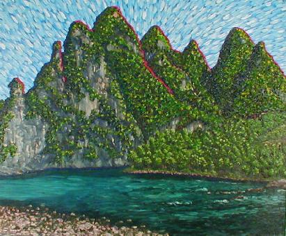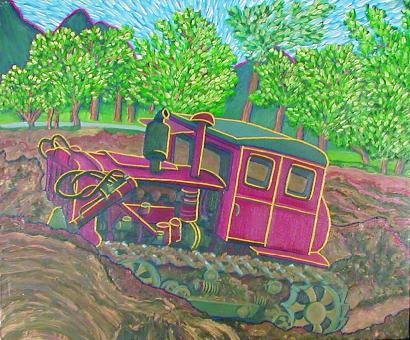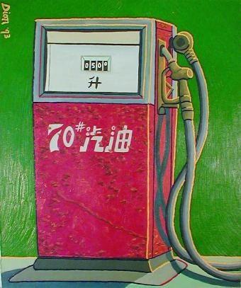 I visited China in 1993, landing in Guilin from Hong Kong. I was disappointed by the "city feel" of Guilin yet inspired by that same industrial/city atmosphere to paint a gas pump. I asked around and quickly settled on heading south to Yangshuo. Yangshuo at the time was more ideally the environment I came to China for, so I settled in a hotel for a few weeks and started exploring around what was then a beautiful and cozy little town in a pleasant rural river valley region. It was much colder than I had considered, so I bought a military surplus coat and cap in Guilin as they were the most effective looking clothes to wear while painting plein-air in the cold damp. Early on, it rained cold for a few days, so I holed up in my poorly heated room in Yangshuo and painted a self portrait in my new military clothes. When it cleared several days later, I took a few trips up the Li River a good several kilometers by boat to scout out a place to paint and was dropped off a few days later and started painting a scene of the river and the beautiful camel back mountains. Every day as I walked to and from the river on my painting journey, I saw an old man as old as ever I'd seen, convincingly so, and his eyes were blue from age, it seemed, yet he appeared to see everything. I swear his eyes were clear as day and blue as fresh river water, and he saw everything and everyone. Each time I saw him, he was sitting on a crate in front of his little one room home with its dark dirt floor, or he was standing inside in the dark, looking out. The first time I saw him we made eye contact and he offered me a tangerine and would not accept money. I bought a few tangerines from him every day the rest of my stay. While painting along the river in a rather isolated place with no building or telephone or electric line in sight, no sounds but the trickles and splashes along the shore of the rocky beach upon where I sat painting, two young men emerged quietly and surprisingly from the bamboo forest behind me. They appraoched, stood back at a distance and smiled as they watched me paint a bit. Just after I departed alone with the the captain of the gas powered canoe that morning, I realized I had forgotten to get beer for the day. When I took a break from painting, one of these young men motioned to my sketch book. He deftly whipped out a quick study of a flowing karate character. I drew a beer, I believe it was Tsing Tao and said "tsing tao" out loud and shrugged my shoulders. After paying for the boat ride up the river that morning, I had only the 100 Yuan which I planned to change when I bought the beer that I forgot that morning. After a bit of back and forth drawing and gestures and smiles, I pulled out my 100 Yuan and they agreed to take it and bring back two big bottles of beer within less than an hour or so. After an hour and a half, I thought I would never see them, two well desired cold beers, nor my 100 Yuan. Another hour later or so, and here they came smiling as two kids with candy. They would not accept a beer, a sip, a tip, no money, not my tangerines. They wanted and I gave them a few nice drawing pens and pencils, They stayed a bit longer and left as quietly and quickly as they had first appeared. I finished the painting of the river, and now was still desperately in search of a bull dozer. Where earth was being moved in this part of China, it was all by the hands of hard working farmers and the brute power of the few visible water buffalo and ox. In all my travels and in each country that I visit, I paint a triptych of a bull dozer, a gas pump, and a landscape. This is my Travel Series. But here in China, I had not seen one bulldozer or backhoe or any such machine. I had given up with disappointment that I could not find a bulldozer to paint and boarded the bus to Guilin. This is always the ride of contemplating the experience of travel and adventure to this place with these people and experiencing the last views of the landscape and the people flashing by. Wow! Suddenly there it was as the bus bumped along to the airport, a beautiful old red bulldozer at work moving big piles of red earth. I couldn't believe that in these few weeks this beautiful red dozer was just several kilometers from Yangshuo. When I arrived at the airport I emotionally pleaded to change my unchangeable return ticket. After a good half hour or so, I was allowed to change my ticket for another week at no charge. I returned to the hotel and planned for painting the red bull dozer. The next day I took a motorcycle taxi in the cold drizzle to the dozer. It was in fact moving and mixing red clay and charcoal at a brick factory. I can hardly describe how physical the work appeared, how deep the wear and tear and exhaustion on the workers hung heavy in their very soul. I started painting as the dozer crawled as heavy as the men, back and forth, back and forth, heavy. I struggle for a few hours, wiped my canvas clean, and left. I returned the next day, still cold but clear, and painted my Red China Bulldozer. These are the four images I am submitting to you with this email. I will send more images soon.